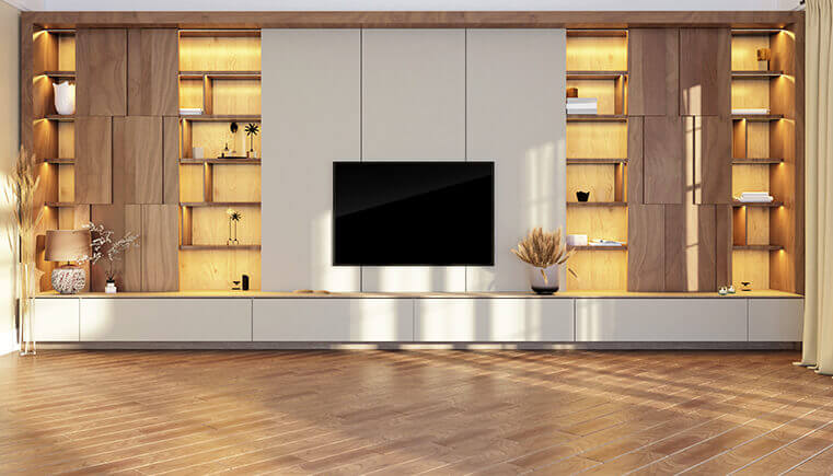 Transform your dream space into a beautiful reality with our Custom-Built Entertainment Units. In addition to enclosing your TV, our modern TV cabinets come with aesthetic storage space for books, CDs, game consoles, and home decor items. Wires and cables are kept hidden to reduce the clutter and there are practical components, making them ideal for storing controllers and your favourite movies.